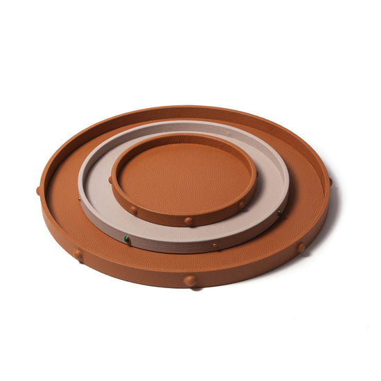 The Alula Trays bring refined simplicity to any space with their sculptural silhouette and timeless design. Handcrafted from 100% natural leather, each tray features a smooth round form, subtle raised edges, and hand-applied detailing that elevates both function and style, crafted using refined leather marquetry