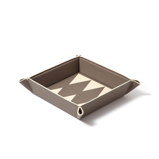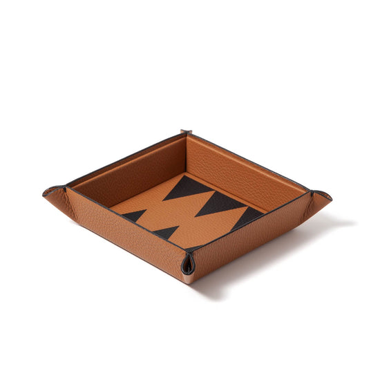 This vide poche tray is handcrafted in leather marquetry, inspired by the geometry of backgammon boards. Designed to lighten your daily load, it works as a catchall for keys, jewelry, or keepsakes, adding a playful elegance wherever you place it.