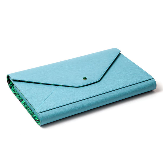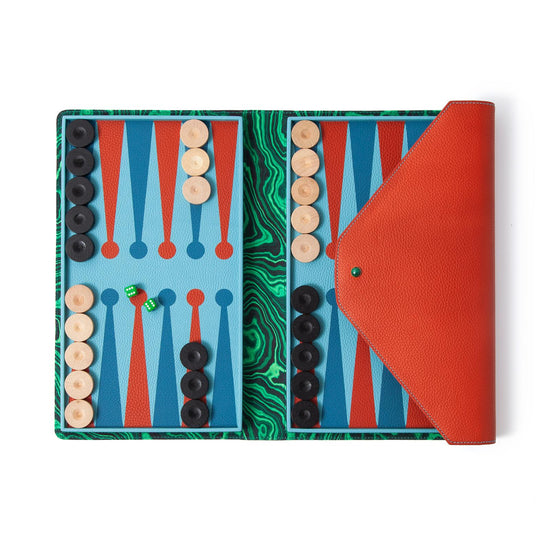 This travel backgammon set is crafted in Madame Malachite’s signature envelope form and sealed with a natural malachite cabochon. Each piece is handcrafted using leather marquetry techniques, blending geometry, symbolism, and function into a slim, sculptural silhouette.
