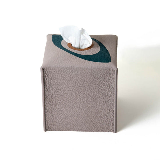 Elevate your space with this tissue box featuring a striking evil eye crafted in leather marquetry, lined with our unique malachite fabric for added elegance.