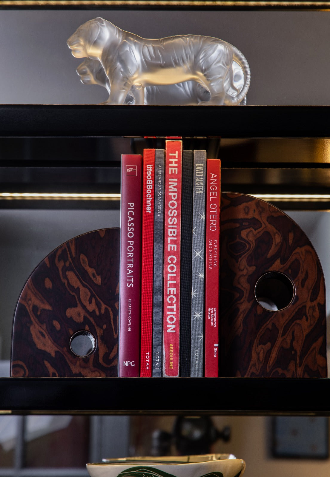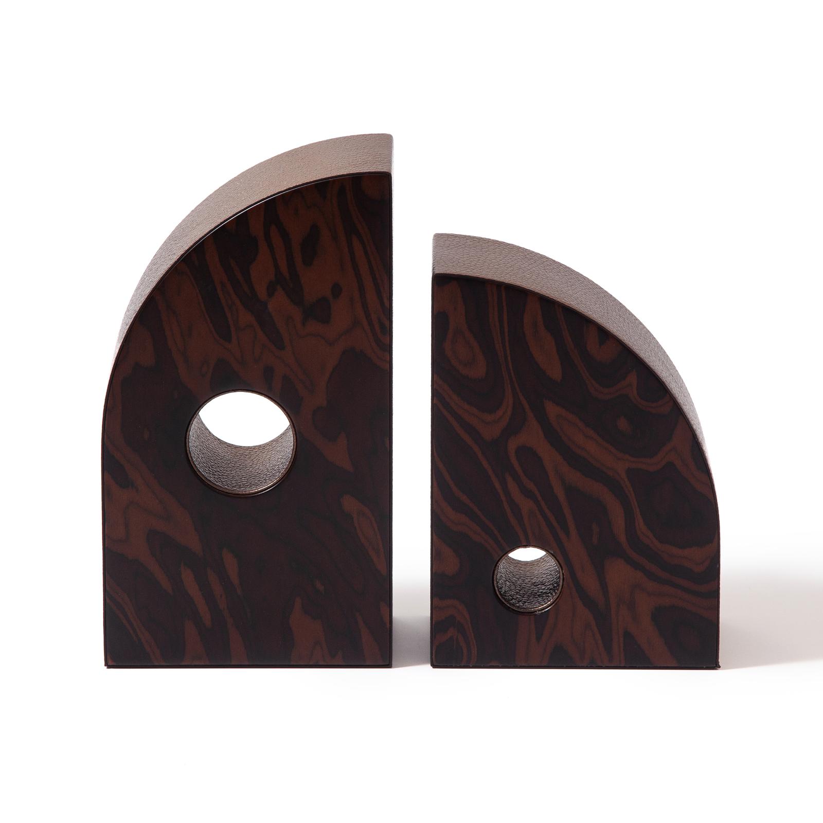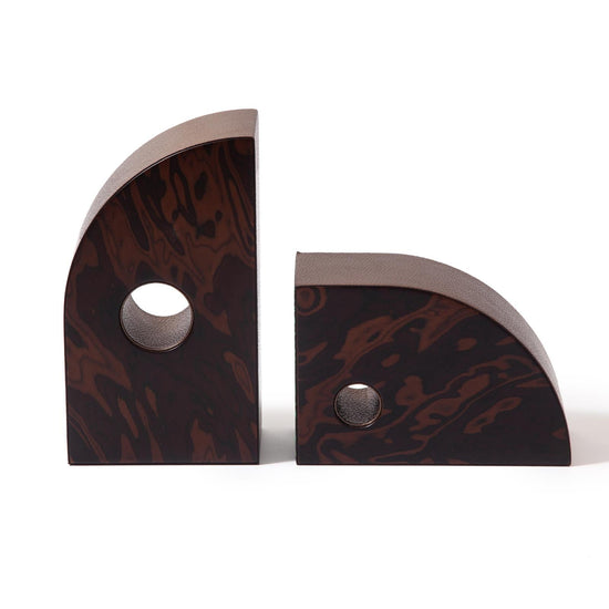 Sculptural bookends with a peephole, where we take a glance of the curiosities around us. Madame's favorite bookends made out the mesmerizing Burl wood, resembling the Malachite pattern.