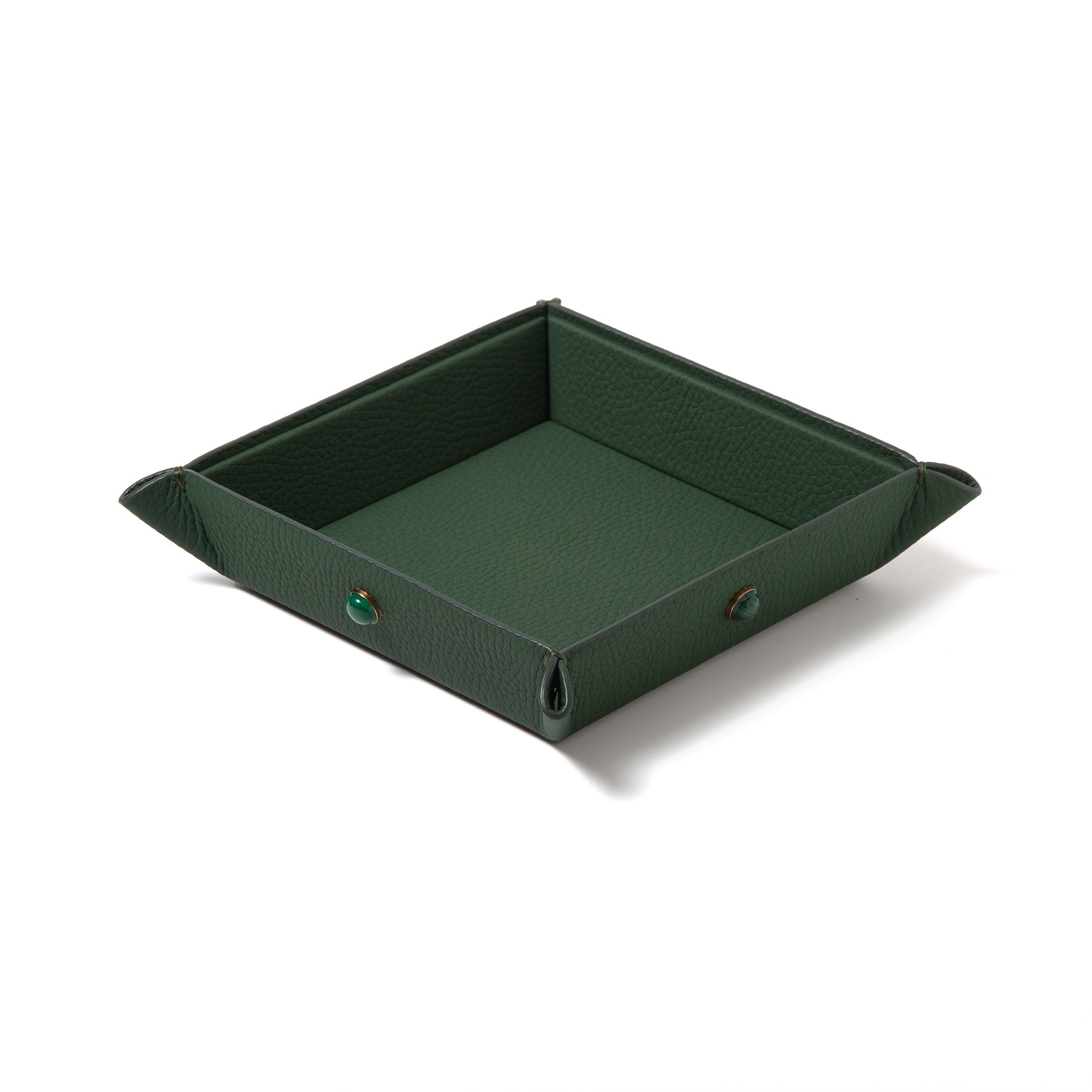 This TEHO tray is handcrafted in leather marquetry, jeweled with 4 malachite stones. Designed to lighten your daily load, it works as a catchall for keys, jewelry, or keepsakes, adding a playful elegance wherever you place it,